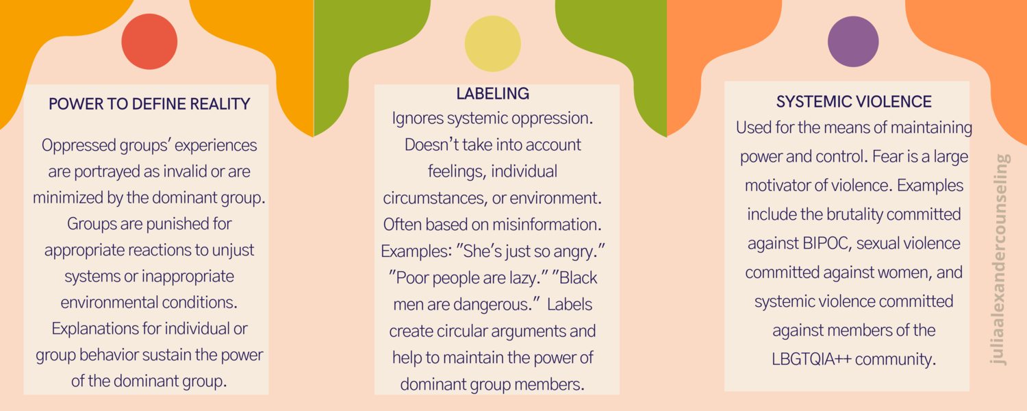 As a therapist, I am concerned about the mental health impacts of internalized oppression on people with marginalized identities. I am also concerned about the mental health costs of unacknowledged privilege: internalized domination. The inevitable internal conflicts that arise when we hold both internalized oppression and domination within, is also a concern from a mental health perspective.